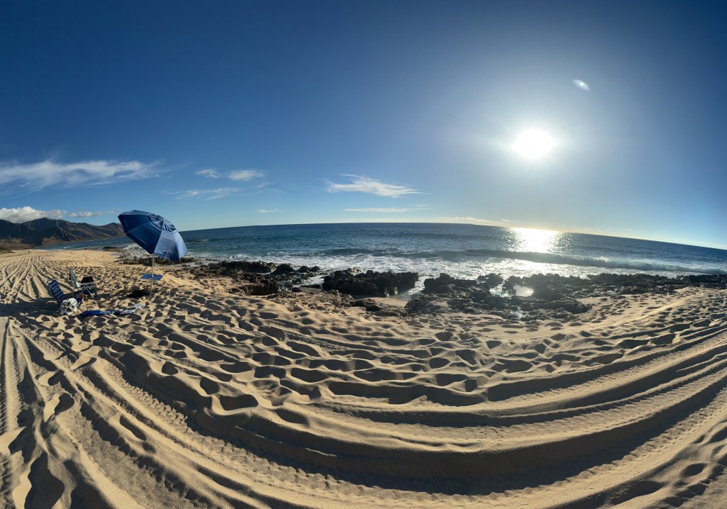 For creatives like us, the morning is a time of cinematic exploration – part because our brains play mini movies of life’s experiences, part because we had just started our new You Tube channel. The gentle breeze rustles through the palm trees, creating a mesmerizing visual symphony and making it a perfectly pleasant day at the beach. The waves crash telling a story of resilience and grace. We were practically alone on this west Oahu wonder, the shore playing for an audience of two.